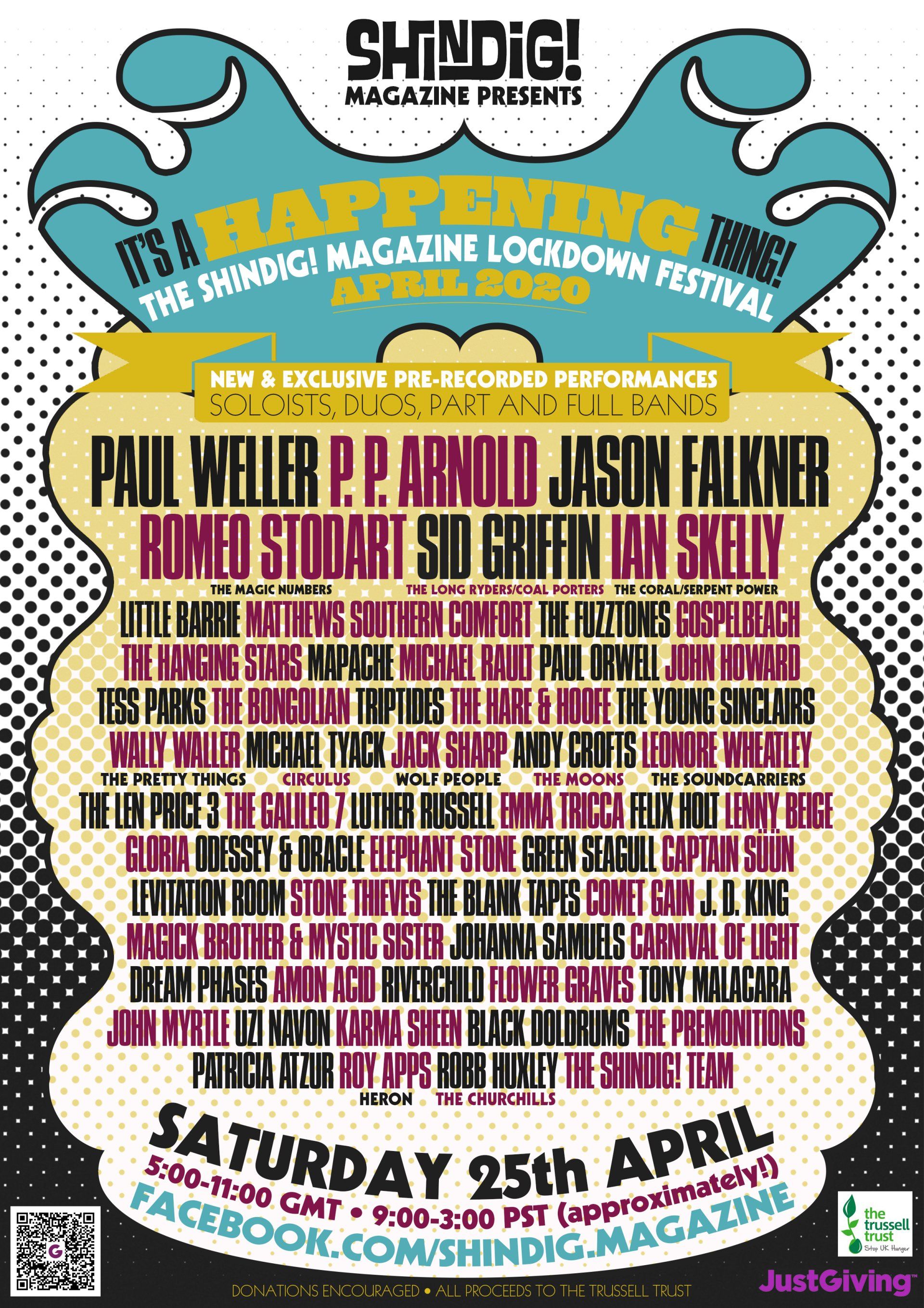 It has been Psych-A-Rella's pleasure and privilege to work closely with Shindig! Magazine for a number of years. Beginning with ben writing some live reviews for the magazine before taking over the online side of the mag. During this time The Shindig! Revue was born, 8 live shows at The Victoria in Dalston, London over the space of 2 years. We had some amazing nights and met the greatest people and were really on a roll until.....Our work with Shindig! culminated during the pandemic of 2020 where we joined forces to create something special. A 6 hour online festival! A seed of an idea germinated into a giant oak of organisation. Artists were approached, and from our list of around 60, 57 said they'd do it! So we got to work with the logistics and technical side of actually doing it, a steep learning curve for a group of analogue lovers! But we did it, and merely 3 weeks after proposing the idea, the Shindig! Magazine Lockdown Festival was aired live simultaneously on Facebook and YouTube. With over 9000 viewers raising £2000 for The Trussel Trust. We followed this with The Shindig Magazine Online Revue, a series of Shindig! Sessions and finally the Shindig! Online Festival 2021- where the technical gremlins finally realised we didn't really know what we were doing and forced an abrupt halt to proceedings. Our heartfelt thanks go out to everybody involved from the super talented performers, to those behind the scenes, to the viewers who left such lovely comments (the most prevalent being "What time's Weller on?") and the Trussel Trust for helping those that needed it most in such a troubling time.